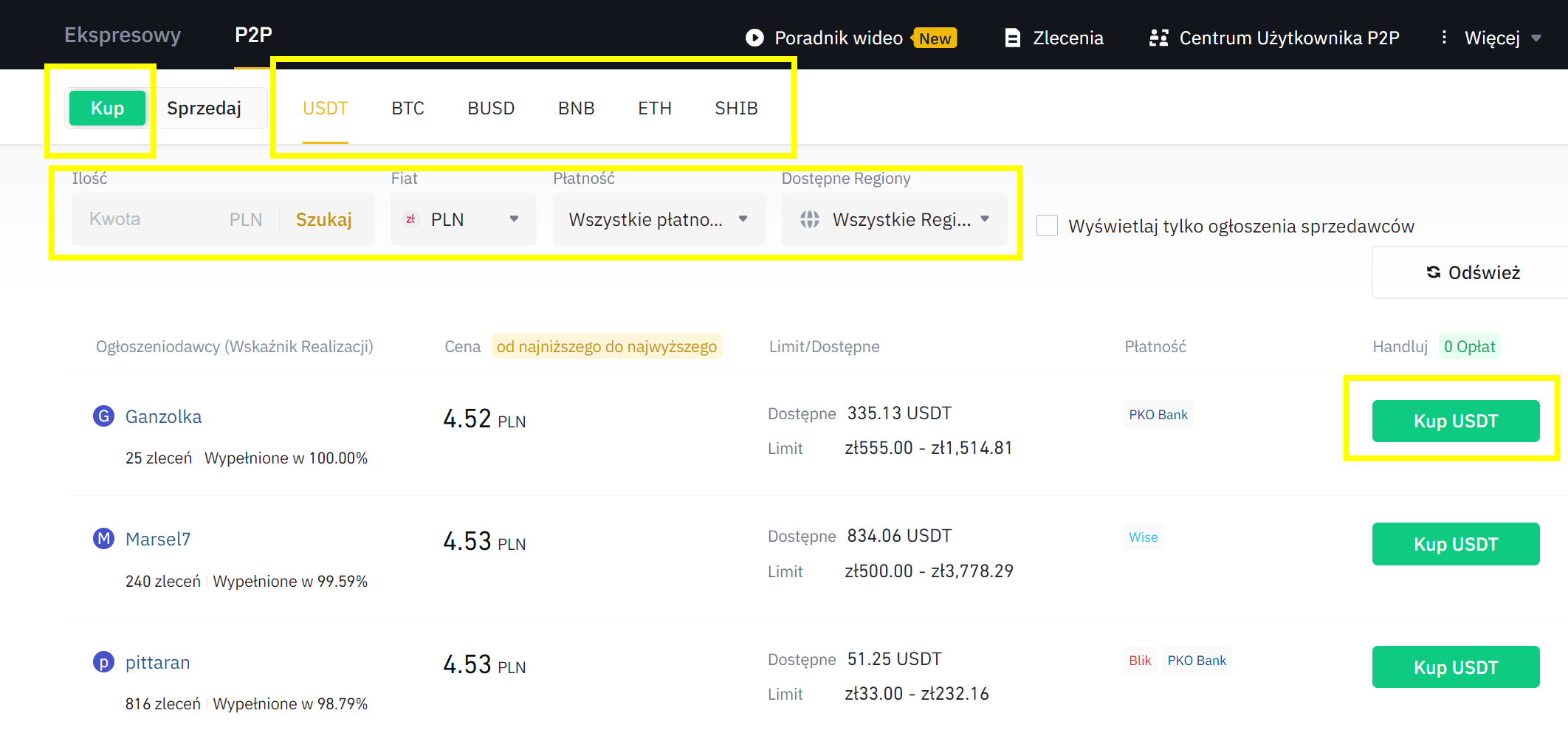3. Wybierz opcję “Kup”, a następnie kryptowalutę, którą chcesz kupić. Znajdź odpowiednią ofertę (możesz je filtrować) i kliknij “Kup XXX”.