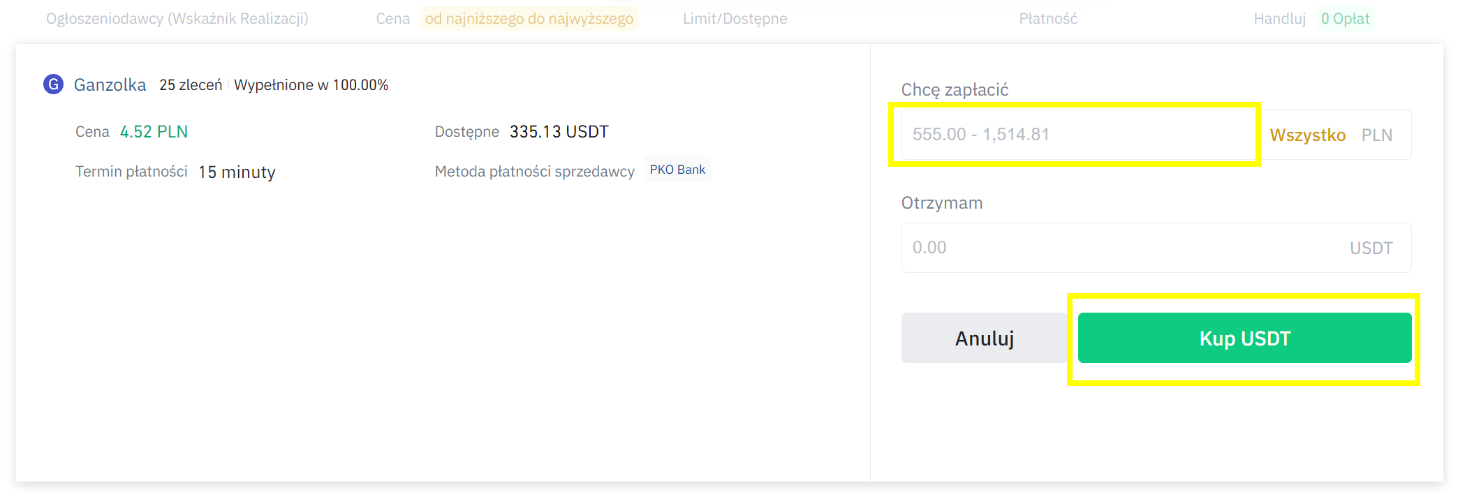 - Brak opłat – Binance P2P nie obarcza swoich użytkowników żadnymi opłatami. Prowizje musi zapłacić jedynie osoba wystawiająca własne ogłoszenie (i to niewielką).