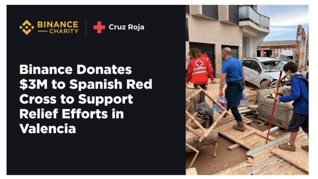 Po niszczycielskich powodziach, które nawiedziły region Walencji, Binance Charity podjęło działania pomocowe. Giełda przekazuje 3 mln USD na rzecz Hiszpańskiego Czerwonego Krzyża (Cruz Roja Española).