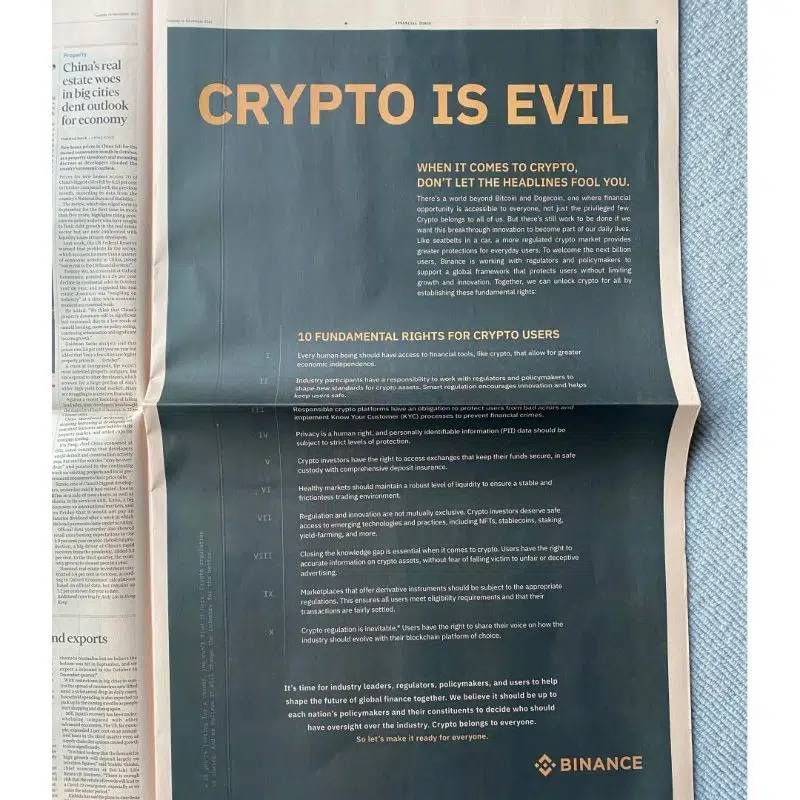 Reklama Binance w brytyjskiej gazecie ekonomiczno-finansowej zawiera ogromny nagłówek, w którym czytamy: “Kryptowaluty to zło”. Największa na świecie giełda kryptowalutowa pod względem wolumenu rynkowego rozwiązuje dylemat nagłówka w ten sposób: