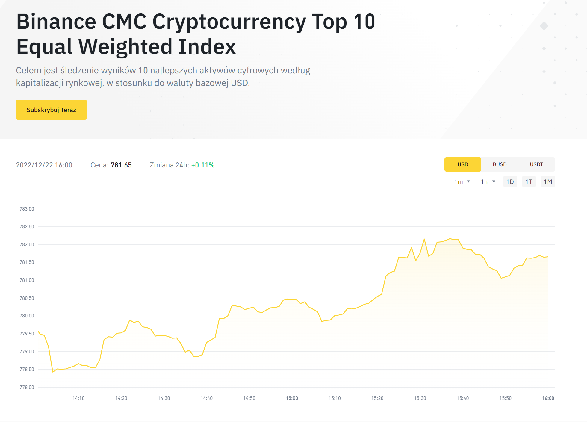 Co czyni Binance CMC Cryptocurrency Top 10 Equal-Weighted Index wyjątkowym? Cóż, każde aktywo w tym indeksie jest równo ważone i równoważone co miesiąc, aby odzwierciedlić najświeższe ruchy na rynku. Seria rozpoczyna się od denominowanego w USD Binance CMC Top 10 Equal-Weighted Index, który śledzi wyniki dziesięciu najlepszych kryptowalut według kapitalizacji rynkowej – i od grudnia można go wykorzystać w funkcji Automatycznych Inwestycji Binance.