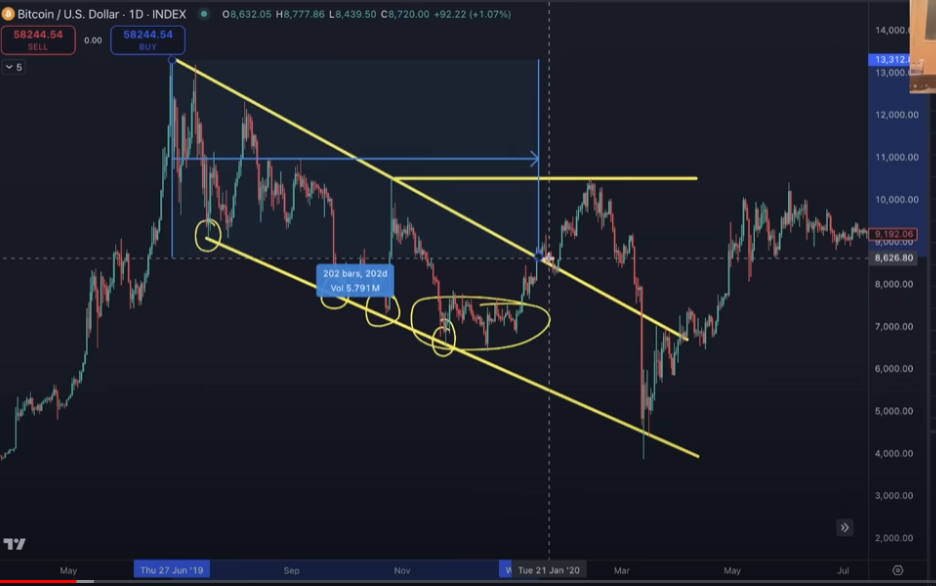 Opierając się na wykresie z 2019 roku, Benjamin Cowen jest pesymistycznie nastawiony do ceny Bitcoina. Według analityka, w tamtym czasie Bitcoin potrzebował 202 dni, aby wyjść z podobnego trendu spadkowego. Teraz schemat ten może się powtórzyć.