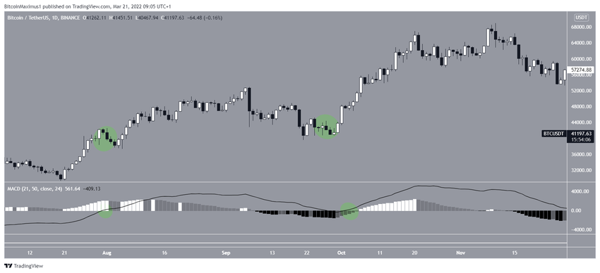 W dniu 21 marca Bitcoin odbił się od poziomu wsparcia przy zniesieniu 0,382 Fib i utworzył długi dolny knot (zielona ikona).