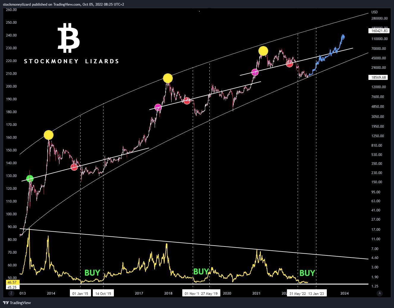 Stało się tak na zaznaczonych poniżej obszarach (żółte i czerwone). Warto zauważyć, że ze wszystkich tych trzech przypadków najniższa wartość RSI pojawiła się w czerwcu 2022 roku. Jednak zawsze powolnie rosnącemu wskaźnikowi towarzyszyła boczna akcja ceny Bitcoina i kilkumiesięczna konsolidacja. To również wzmacnia tezę wznowieniu rynku byka najwcześniej w I kwartale 2023 roku.