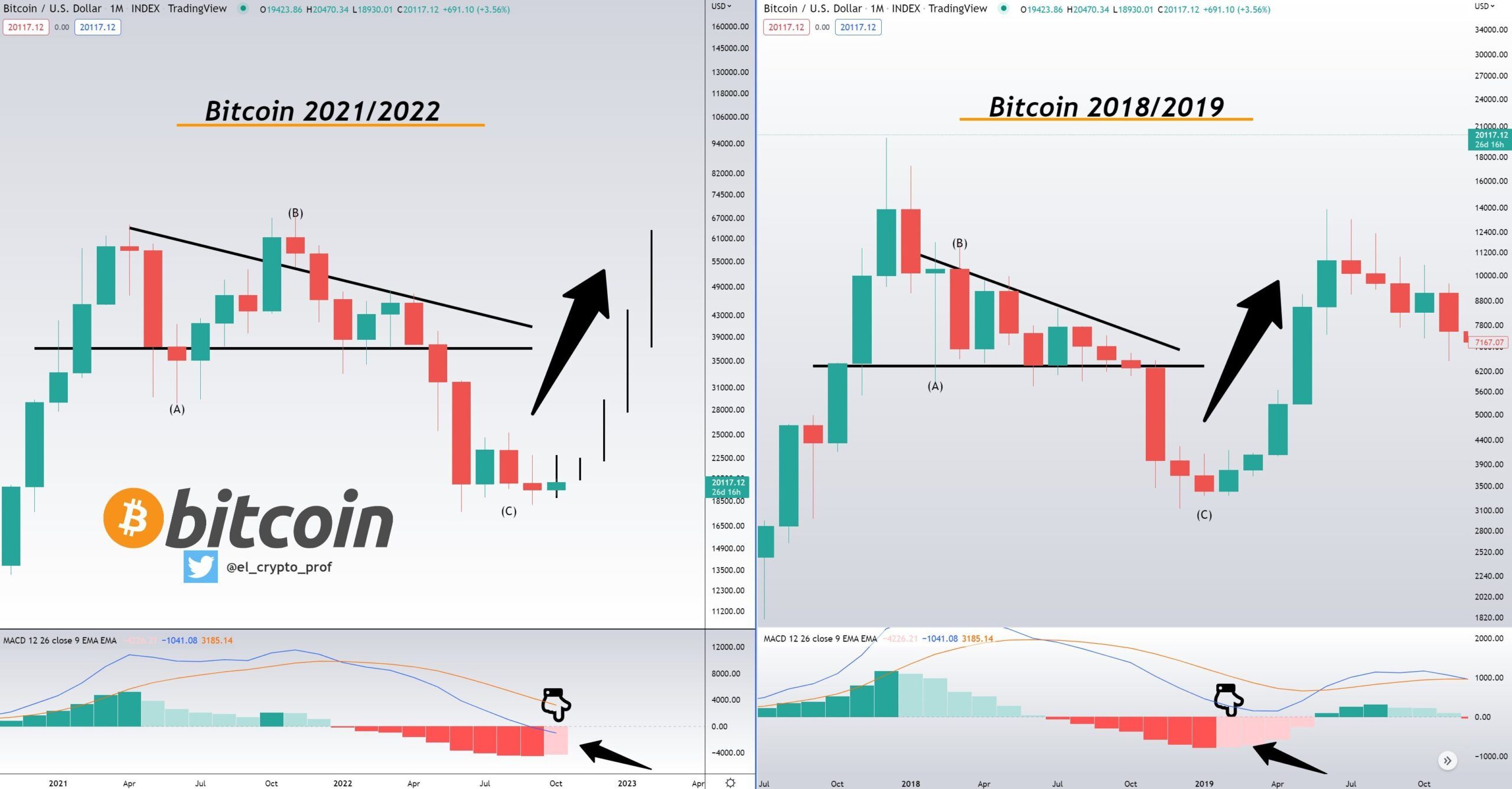 Zwrócił na to uwagę @el_crypto_prof, który we wczorajszym tweecie porównał odczyty MACD z lutego 2019 i października 2022 roku. Jego zdaniem zmiana negatywnego słupka na histogramie MACD z ciemnej czerwieni na jasną była sygnałem zakończenia rynku niedźwiedzia. Podobny sygnał może zostać wygenerowany w tym miesiącu, jeżeli Bitcoin przynajmniej utrzyma aktualny poziom w okolicach 20 000 USD. Jednak o tym przekonamy się dopiero pod koniec bieżącego miesiąca.