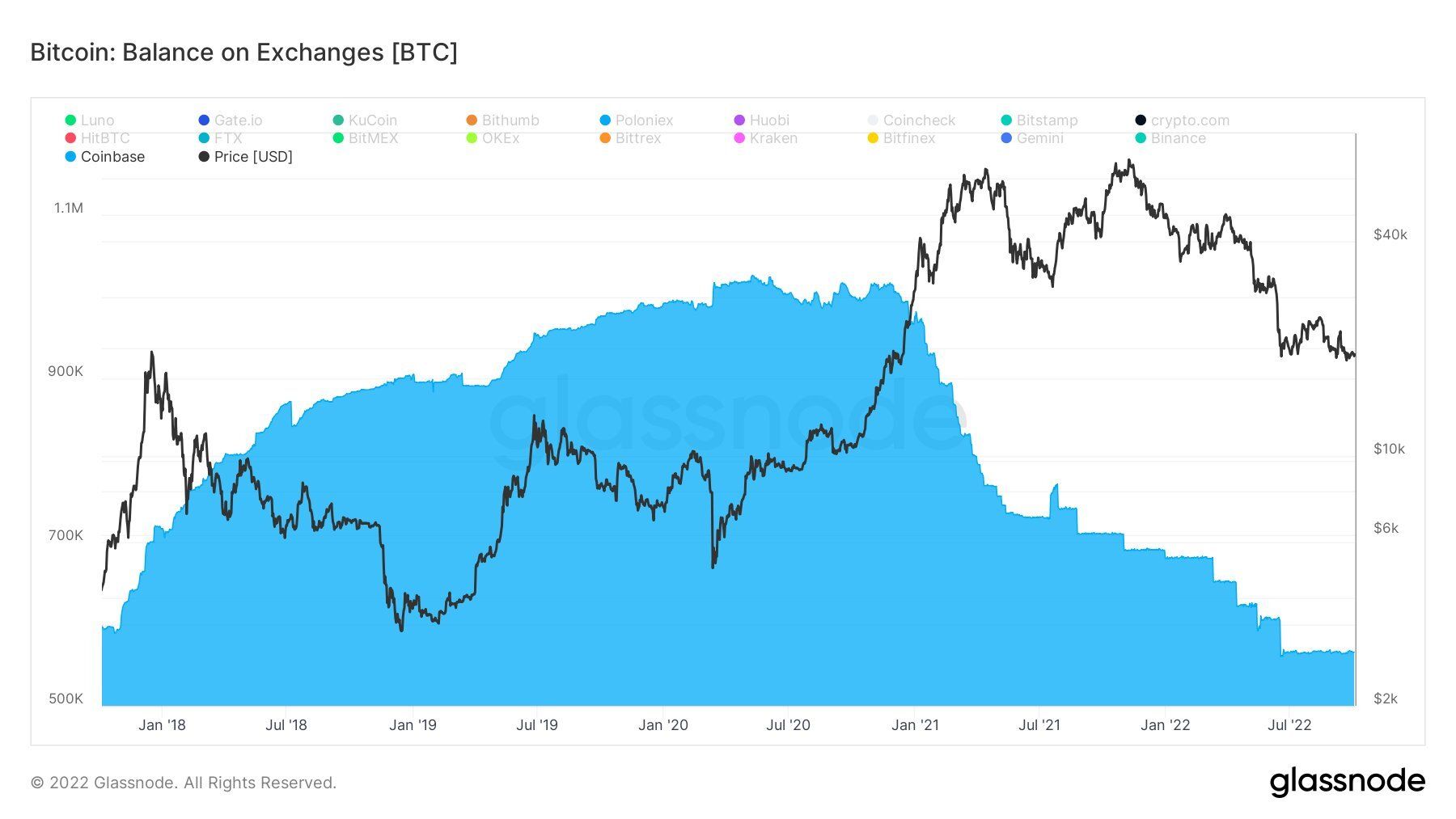 Pierwszy wykres opublikowany przez @IIICapital pokazuje, jak ilość Bitcoina na Coinbase systematycznie spada od początku rynku byka zainicjowanego w IV kwartału 2020 roku. Co ciekawe, odwrócenie trendu w cenie Bitcoina i jego spadki w 2022 roku wcale nie zatrzymały odpływu monet z giełdy. Jedynie w okresie od czerwca do teraz widać wyraźną stagnację na niebieskim wykresie i względną stabilizację podaży BTC na Coinbase.