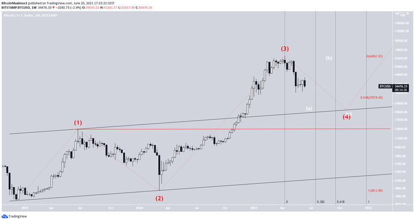 Liczba fal pokazuje, że Bitcoin jest prawdopodobnie w fali czwartej (czerwona) byczego impulsu, który rozpoczął się w grudniu 2018 roku. Obecnie spada, potencjalnie kończąc korektę fali czwartej. Liczba fal jest podana w kolorze białym. Wskazuje ona, że BTC prawdopodobnie nadal znajduje się w pierwszej części korekty.