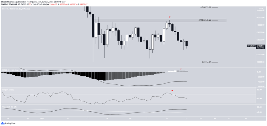 Wykres dzienny również dostarcza niedźwiedziej perspektywy. BTC spada od czasu odrzucenia przez obszar oporu na 41 250 USD w dniu 15 czerwca (czerwona ikona).