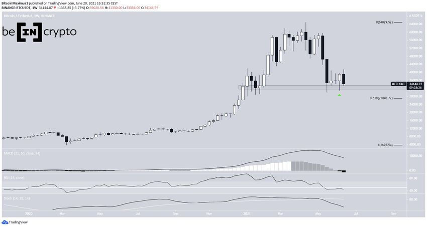 Tygodniowy wykres BTC przedstawia niedźwiedzi obraz. Wydawało się, że Bitcoin rozpoczął byczy trend dwa tygodnie temu po utworzeniu byczej świecy młotkowej z długim dolnym knotem. Odbicie nastąpiło tuż przy długoterminowym horyzontalnym obszarze wsparcia na 32 500 USD (zielona ikona).