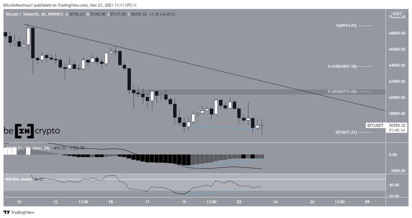 Bitcoin (BTC) spadał wzdłuż opadającej linii oporu od czasu osiągnięcia ATH na poziomie 69 000 USD w dniu 10 listopada. Doprowadziło to do dołka na poziomie 55 600 USD w dniu 19 listopada.