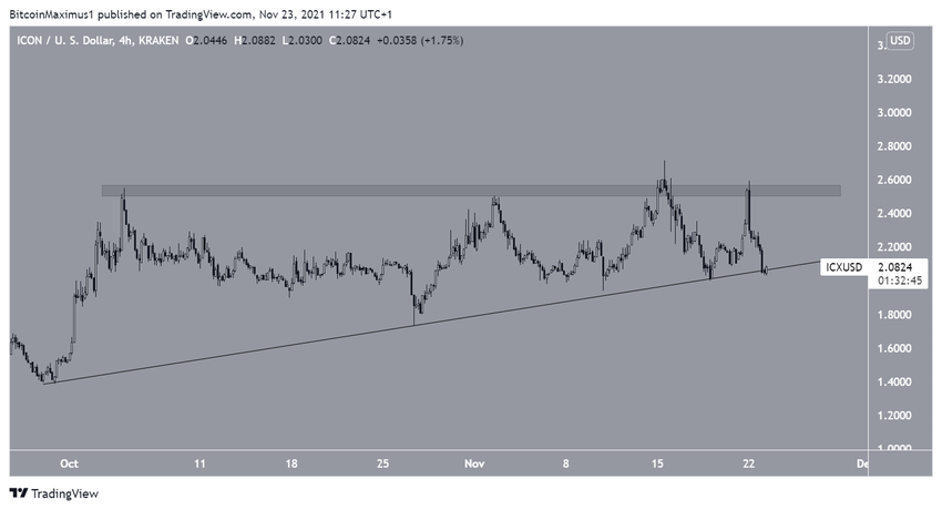 ICON (ICX) wzrasta wzdłuż wznoszącej się linii wsparcia od początku października. Podążając za tą linią, został odrzucony cztery razy przez obszar oporu na 2,55 USD.