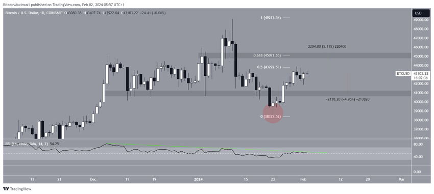 Bycza perspektywa pokazuje, że cena BTC odzyskała horyzontalny obszar wsparcia 41 000 USD po odchyleniu poniżej niego. Jednak handluje poniżej poziomu oporu zniesienia 0,5 Fib na poziomie 43 800 USD.