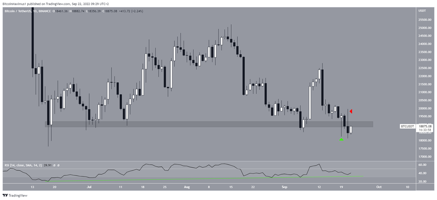 Jeśli chodzi o swój ruch cenowy, BTC utworzył niedźwiedzią świecę z długim górnym knotem w dniu 21 września (czerwona ikona). Świeca ta spowodowała załamanie poniżej obszaru wsparcia 19 000 USD. Zanegowała też wszystkie zyski pochodzące z byczego młota z 19 września (zielona ikona).