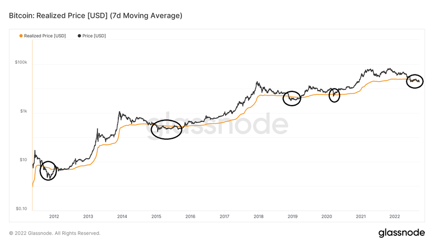 Rzeczywista cena BTC spadła poniżej ceny zrealizowanej pięć razy od 2011 roku. Zrobiła to w sierpniu 2011 roku, styczniu 2015 roku, lipcu 2018 roku, marcu 2020 roku i lipcu 2022 roku (czarne kółka).