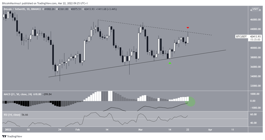 Na wykresie dziennym widać, że Bitcoin od 22 stycznia podąża za długoterminową wznoszącą się linią wsparcia. Odbicie od tej linii nastąpiło 14 marca (zielona ikona) i zapoczątkowało obecny ruch w górę.