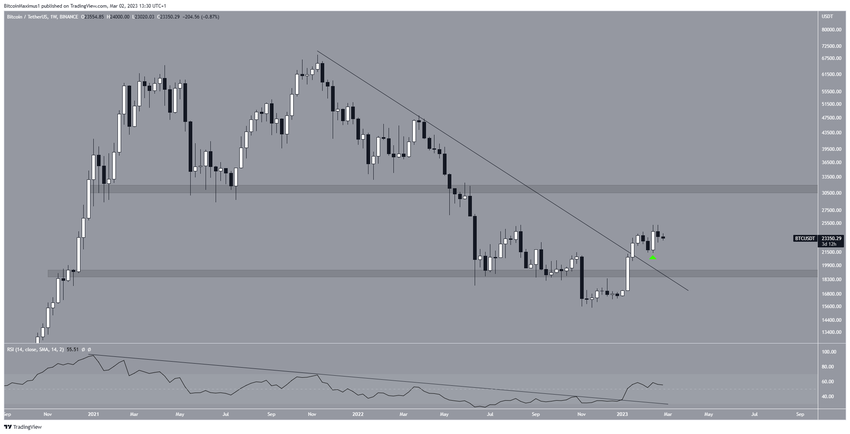 Po pierwsze, cena wybiła się z długoterminowej opadającej linii oporu, która obowiązywała od czasu rekordu wszech czasów (ATH). Po drugie, Bitcoin odzyskał obszar horyzontalnego wsparcia na 19 000 USD po wcześniejszym odchyleniu się poniżej niego w czerwcu 2022 roku. Wreszcie po trzecie, tygodniowy RSI wybił się z własnej zstępującej linii oporu i przeniósł się powyżej 50. Wreszcie, cena BTC utworzyła dwa tygodnie temu byczą świecę pochłaniającą (zielona ikona).