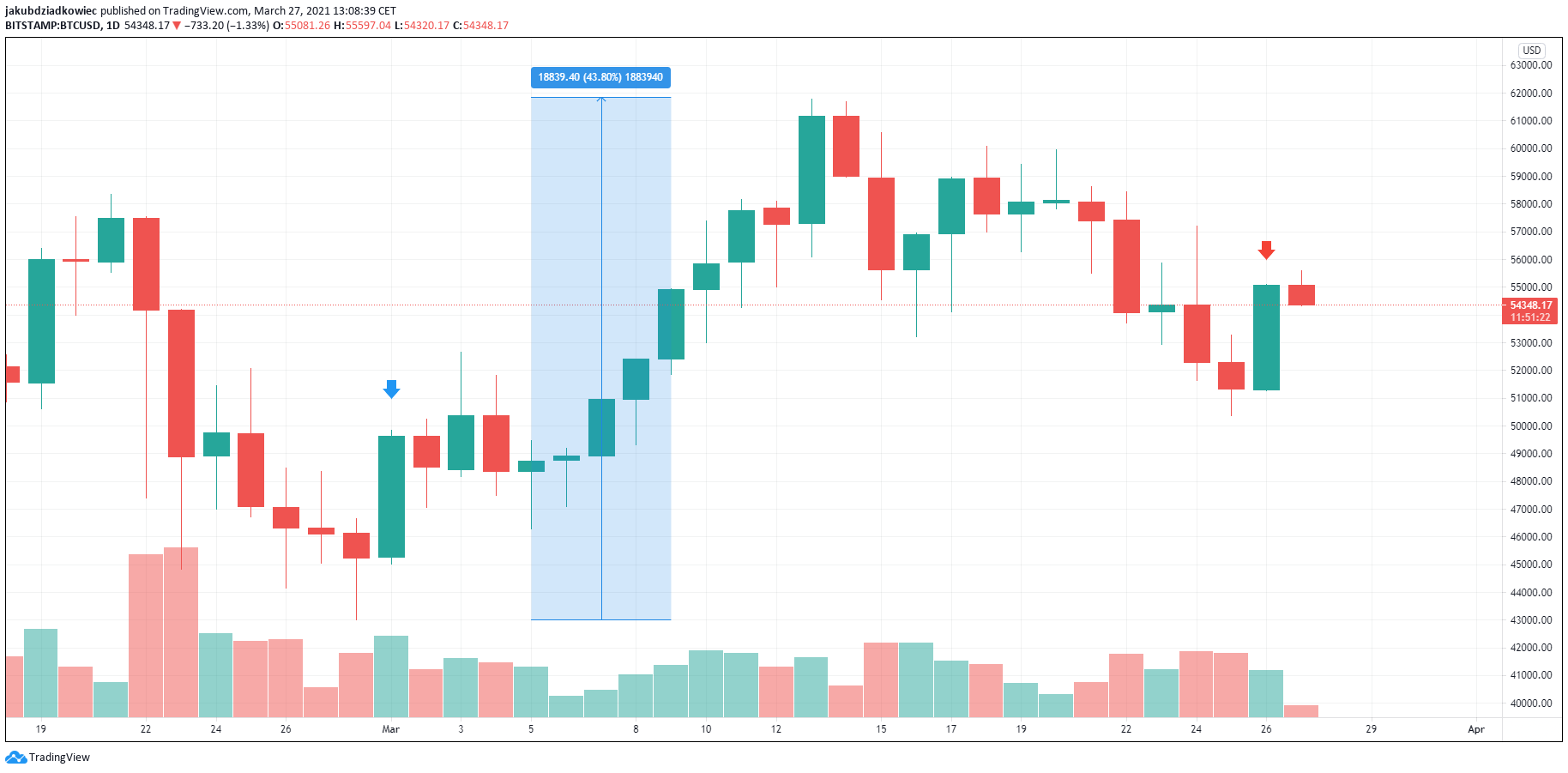 Ostatni piątek marca miał miejsce wczoraj, a wraz z nim wygasły opcje na łączną kwotę około 6 mld USD. Jak zareagował Bitcoin? Cena momentalnie ruszyła w górę i wygenerowała byczą świecę pochłaniającą (czerwona strzałka) o korpusie 7,28%. BTC wzrósł z poziomu 51 200 USD do obszaru 55 000 USD. Ostatnio, gdy Bitcoin wygenerował taką świecę w dniu 1 marca (niebieska strzałka), to wzrósł dalej łącznie o 44%.