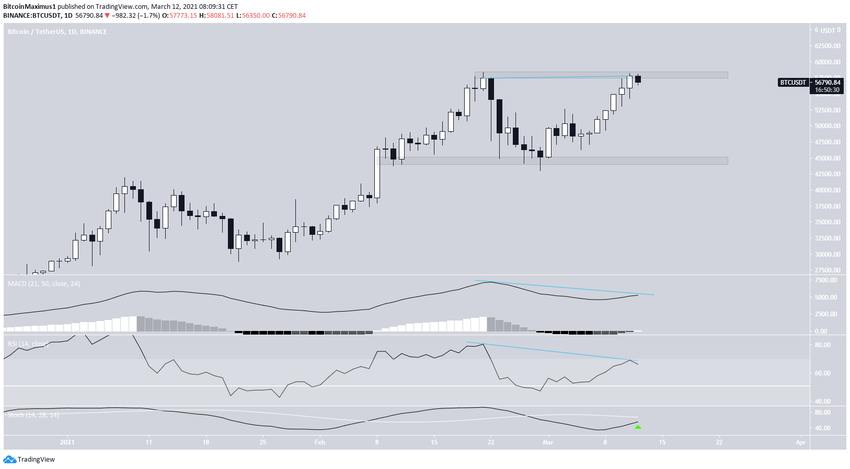 Pomimo ciągłego wzrostu możliwe jest, że BTC wygenerował wzorzec podwójnego szczytu. Podwójny szczyt jest uważany za niedźwiedzi wzór odwrócenia. Ten szczególny podwójny szczyt również wykazuje niedźwiedzią dywergencję zarówno na RSI, jak i MACD.