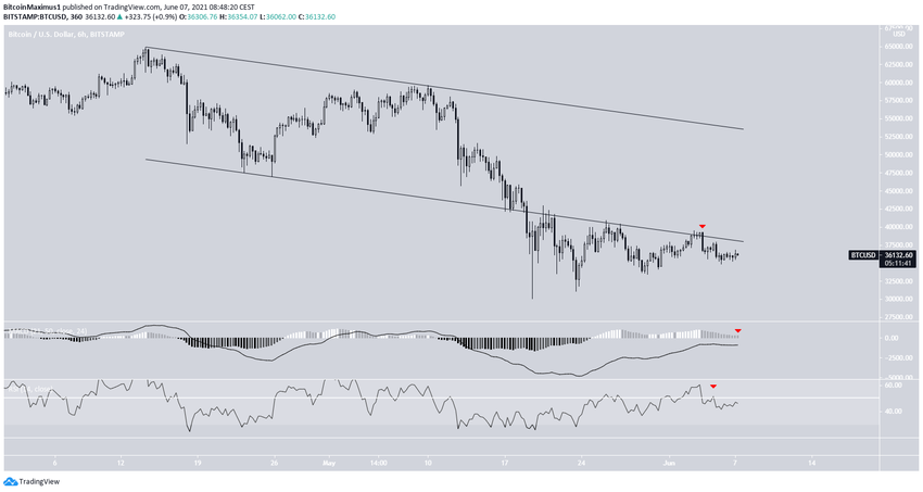 Wykres sześciogodzinny znów jest niedźwiedzi. W dniu 4 czerwca linia wsparcia równoległego kanału opadającego zadziałała jako opór. Odrzuciła BTC, tworząc wcześniej wspomnianą niedźwiedzią świecę pochłaniającą.