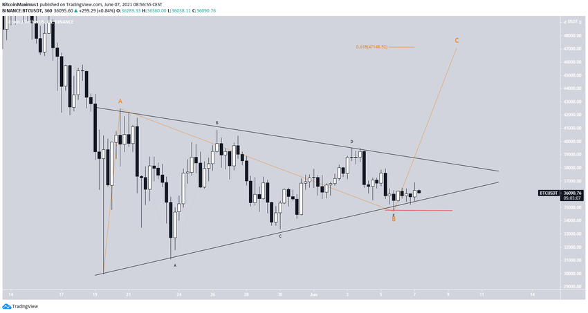 Liczba fal nie jest do końca jasna. Byczy scenariusz wskazuje, że cały ruch wewnątrz trójkąta był częścią fali B. Jeśli tak, to BTC może wkrótce doświadczyć wzrostu w kierunku 48 000 USD.