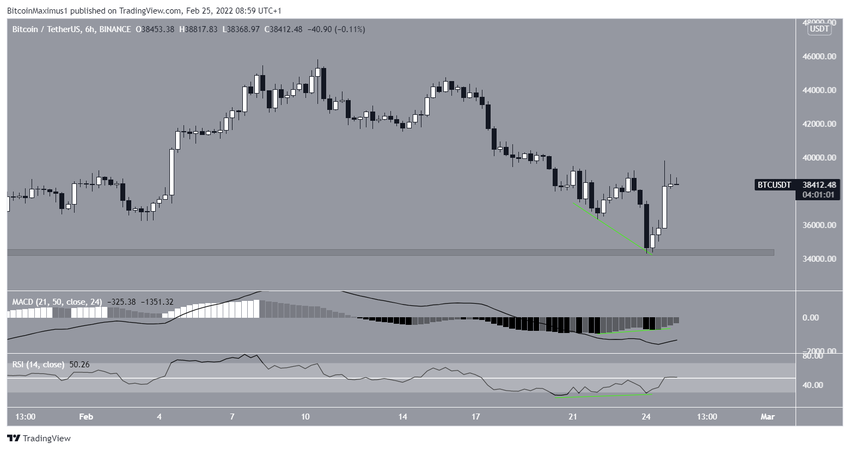 Bitcoin początkowo spadł w dniu 24 lutego, osiągając dołek na poziomie 34 332 USD. Jednak zaraz potem odbił się od dna i utworzył bardzo długi dolny knot o wielkości 8,60%. Ponadto, odbicie posłużyło do potwierdzenia obszaru horyzontalnego 34 400 USD jako wsparcia.
