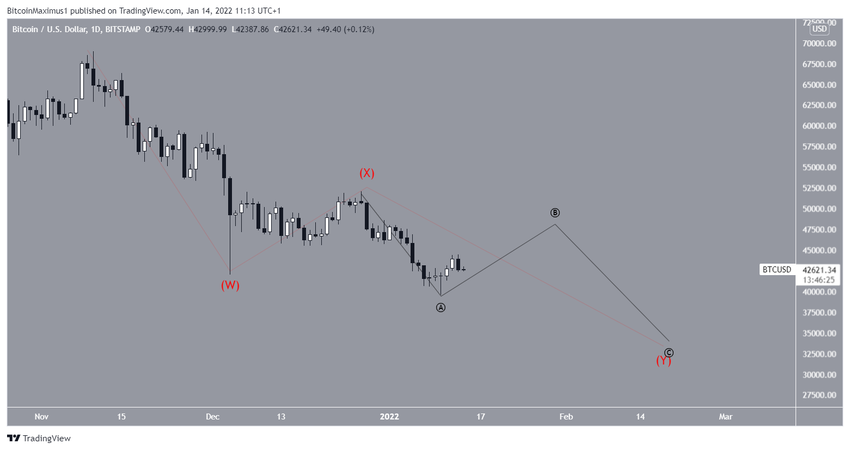 Pierwsza z nich sugeruje, że BTC koryguje się wewnątrz formacji korekcyjnej W-X-Y (czerwona) od momentu osiągnięcia rekordu wszech czasów na poziomie 69 000 USD w dniu 10 listopada. Liczba podfal jest zanzaczona na czarno.