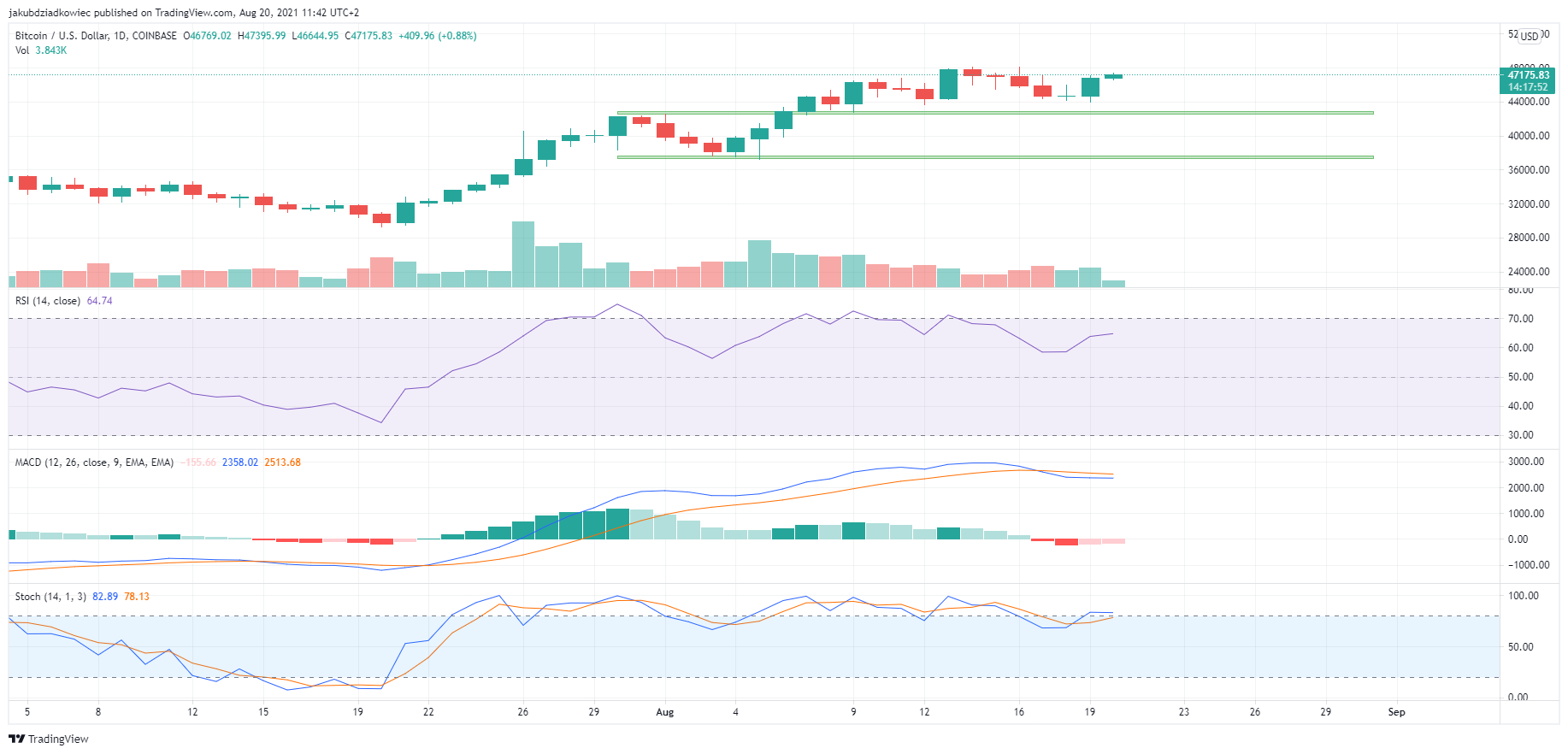 Po wygenerowaniu świecy nagrobka doji w dniu 18 sierpnia BTC wzrósł wczoraj prawie o 5% i osiągnął zamknięcie na poziomie 46 765 USD. Dzisiaj Bitcoin kontynuuje wzrosty i próbuje przebić poprzedni szczyt na 48 150 USD z 14 sierpnia. Wczorajsze wzrosty doprowadziły do ponownego odzyskania 200-dniowej średniej kroczącej, wokół której BTC oscyluje od prawie 2 tygodni.