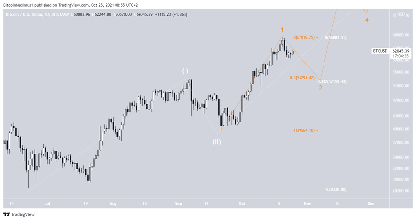 Druga liczba fal jest nieco bardziej niedźwiedzia, sugerując, że Bitcoin nadal znajduje się w fali drugiej (białej) tego samego byczego impulsu.