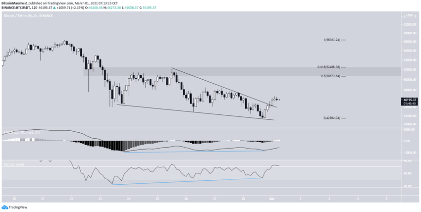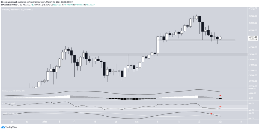 Wykres dzienny pokazuje, że BTC jest obecnie notowany powyżej niewielkiego obszaru wsparcia wynoszącego 44 800 USD. Po raz drugi zweryfikował ten poziom i utworzył dolny knot.