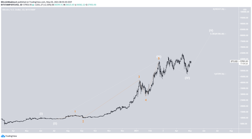 Liczba fal wskazuje, że Bitcoin nadal znajduje się w długoterminowym impulsie wzrostowym (biały), który rozpoczął się od dołka z marca 2020 r.