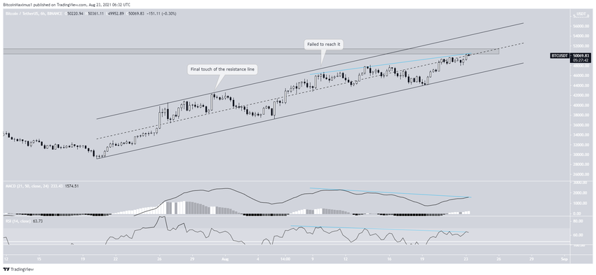 Wykres sześciogodzinny pokazuje, że BTC potencjalnie porusza się wewnątrz rosnącego kanału równoległego od dnia 19 lipca.