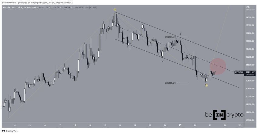 Wykres sześciogodzinny pokazuje, że Bitcoin wzrastał powyżej wznoszącej się linii wsparcia od 19 czerwca. Obecnie linia wsparcia znajduje się na poziomie 20 200 USD, zrównując się z poziomem wsparcia przy zniesieniu 0,618 Fib.