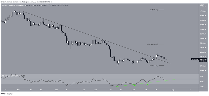 Bitcoin znajdował się poniżej zstępującej linii oporu od 5 kwietnia. Linia ta spowodowała kilka odrzuceń, ostatnio w dniu 7 czerwca. W następstwie tego Bitcoin spadł do długoterminowego dołka na poziomie 17 622 USD w dniu 18 czerwca.
