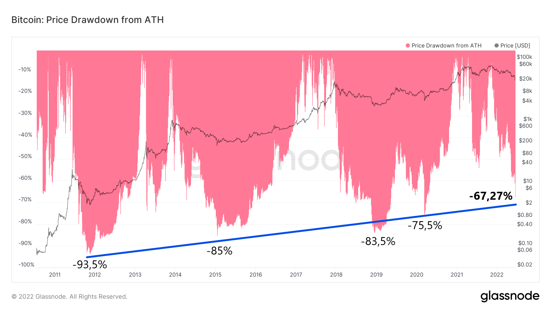 Według danych od Glassnode osiągnięty wczoraj dołek doprowadził BTC do spadku o -67,27% od ATH z listopada 2021 r. Jest to największe odchylenie od czasu wspomnianego krachu COVID-19 z marca 2020 r, gdy BTC znalazł się -75,5% poniżej poprzedniego rekordu. Wówczas cena Bitcoina osiągnęła dołek na 3941 USD, a punktem odniesienia było historyczne ATH na 19 764 USD z 17 grudnia 2017 r.