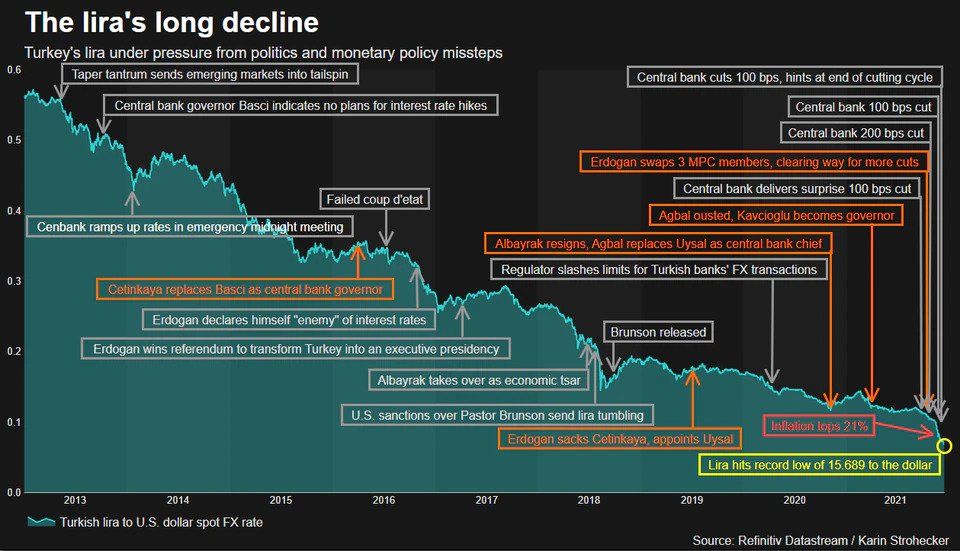 Rola Bitcoina jako magazynu wartości wydaje się teraz krytyczna w Turcji, gdzie inflacja wymyka się spod kontroli. Lira turecka (TRY) właśnie spadła względem amerykańskiego dolara (USD) do najniższej wartości w historii (ATL).