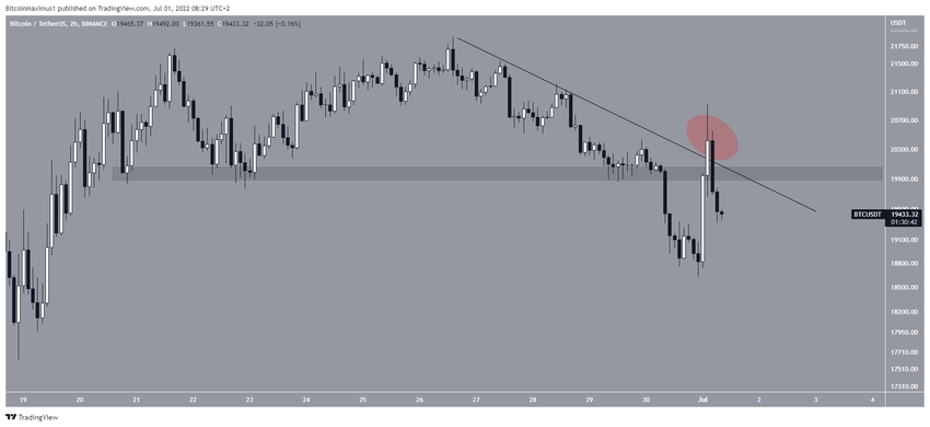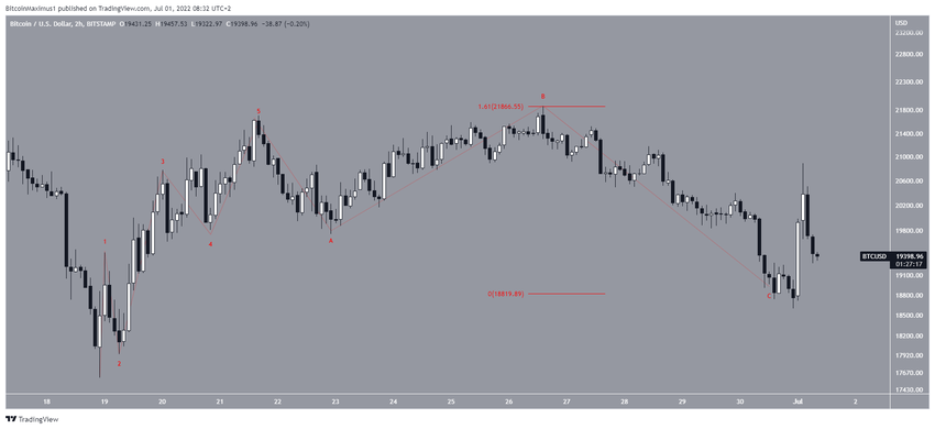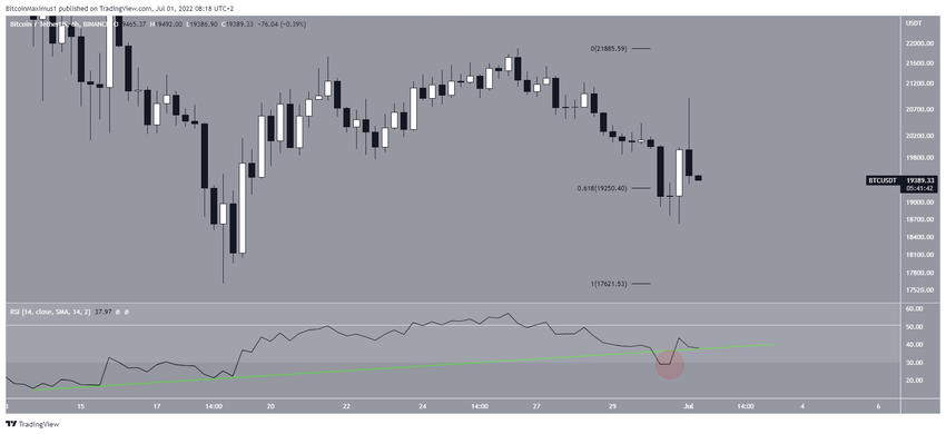 Wykres sześciogodzinny pokazuje, że Bitcoin utworzył swój pierwszy wyższy dołek od 18 czerwca. Wyższy dołek został osiągnięty w obszarze wsparcia zniesienia Fib 0,618 na poziomie 19 250 USD.