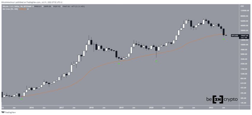 SponsoredWczoraj cena osiągnęła miesięczne zamknięcie poniżej swojej 50-miesięcznej średniej kroczącej (50M SMA, pomarańczowy). Wcześniej 50M SMA odgrywała kluczową rolę w inicjowaniu odbić, działając jako dołek po gwałtownych spadkach (zielona ikona).
