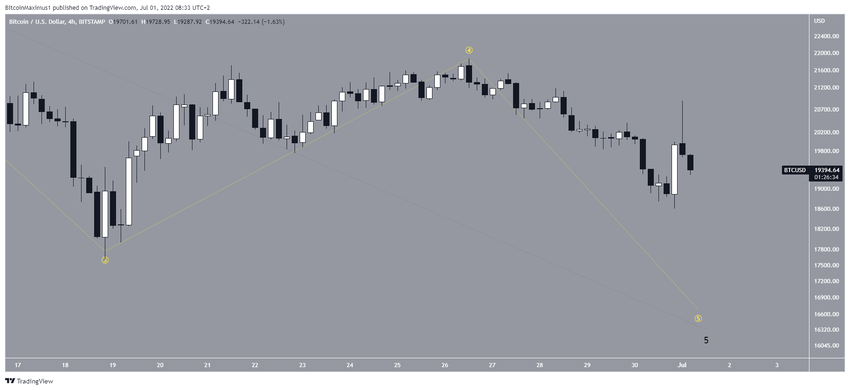 Niedźwiedzia liczba fal wskazuje, że cały ruch w dół od początku czerwca jest częścią fali czwartej (białej) pięciofalowego ruchu w dół. Tak więc w tym przypadku cena spadłaby do 16 000 USD, zanim w końcu doszłoby do odwrócenia.