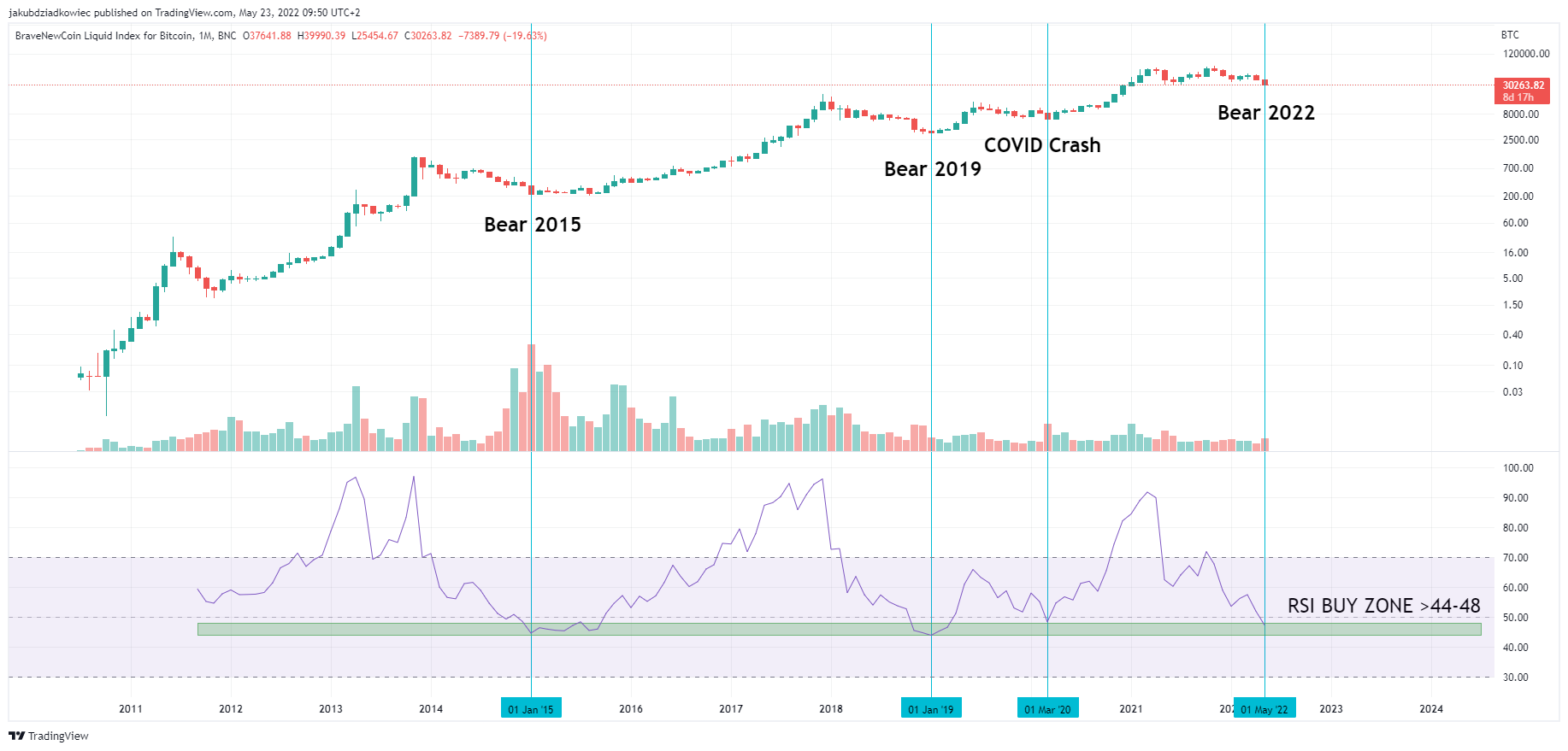 Warto dodać, że RSI na wykresie miesięcznym osiągnęło długoterminowy obszar zakupowy w zakresie 44-48 (zielony prostokąt). Do tej pory w historii Bitcoina miesięczne RSI znalazło się tam dwukrotnie w styczniu 2015 roku i w styczniu 2019 roku. Ponadto raz odbiło się od tego obszaru w marcu 2020 roku.
