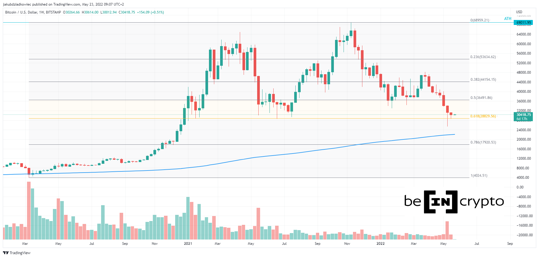 SponsoredWraz z osiągnięciem długoterminowego wsparcia na poziomie 28 800 USD Bitcoin dotarł do zniesienia 0,618 Fib, mierząc od krachu COVID-19 w marcu 2020 roku. Jeżeli ten poziom nie utrzyma się jako wsparcie, to następne cele stanowią 200-tygodniowa średnia krocząca (200W MA, niebieska linia) na 22 000 USD oraz zniesienie 0,786 Fib na 18 000 USD.