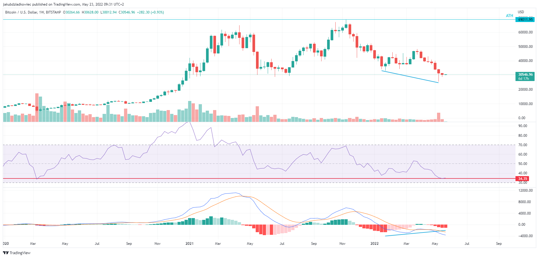 Od czasu osiągnięcia lokalnego szczytu na poziomie 48 234 USD w dniu 28 marca 2022 roku na tygodniowym wykresie Bitcoina pojawiają się tylko czerwone świece. Cena osiągnęła dołek na poziomie 25 400 USD w dniu 12 maja i odbiła się do obecnego poziomu. Oznacza to spadek o 47% w skrajnych wartościach.