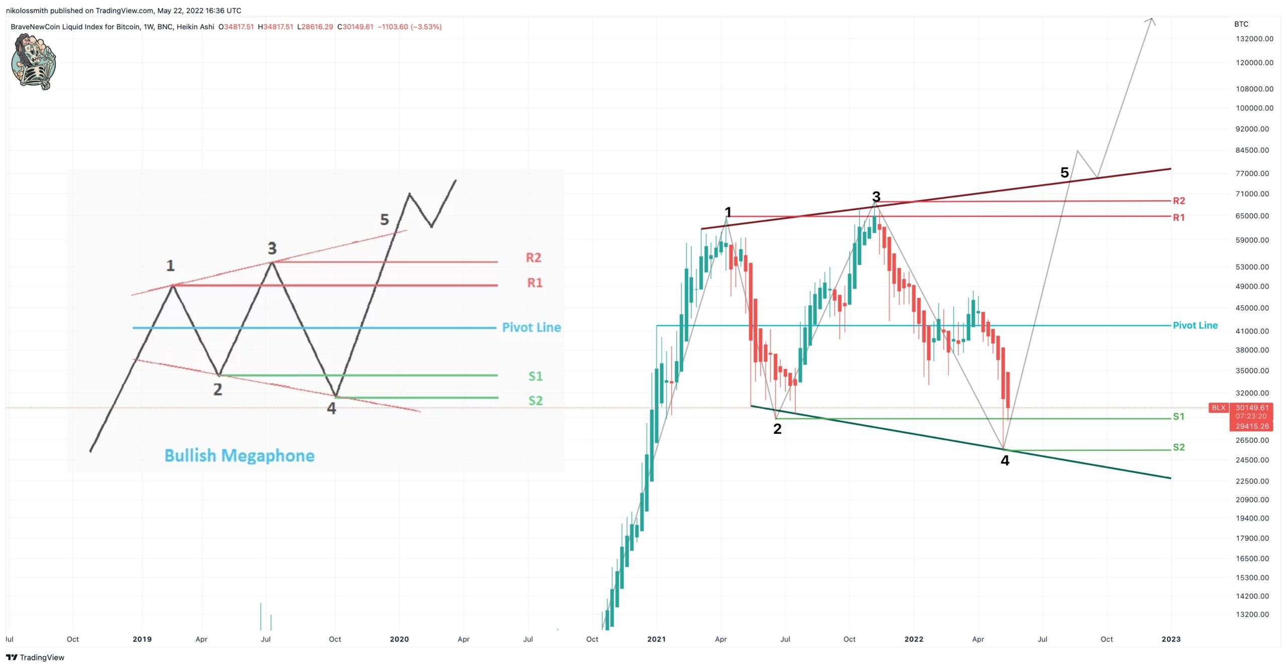 Kryptowalutowy trader @nihkalowz opublikował na Twitterze tygodniowy wykres Bitcoina, w którym posłużył się świecami Heikin-Ashi. Jego zdaniem struktura ceny BTC od początku 2021 roku odpowiada wzorcowi byczego megafonu. Jego ramiona rozszerzają się z czasem, podobnie jak w przypadku wzorca rozszerzającego się klina.
