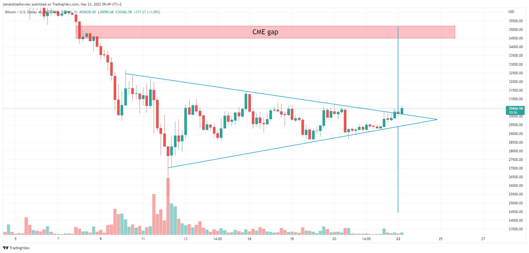 Natomiast na krótkoterminowym wykresie 4-godzinnym dostrzegamy trwające wybicie ze wzorca symetrycznego trójkąta. Wzorzec obowiązuje od spadków z dnia 12 maja i posiada techniczny cel w okolicach 35 000 USD. Obszar ten pokrywa się z CME gap z dni 6-9 maja. Jeżeli jednak wybicie będzie fałszywe i nastąpi załamanie z tego wzorca, to niedźwiedzi cel znajduje się w okolicach 24 500 USD.