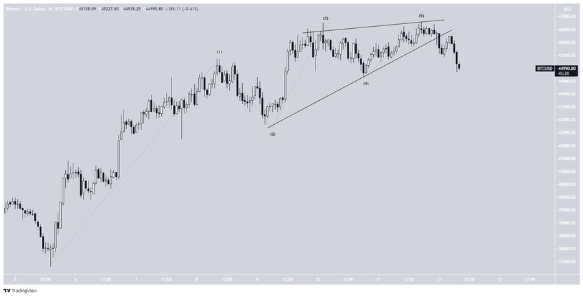 W tym przypadku była to część kończącej się przekątnej, zamykającej się na wysokości 46 743 USD. Po tym, Bitcoin załamał się z klina zwyżkującego i mógł rozpocząć korektę.