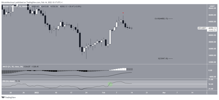 Mierząc cały ruch spadkowy, lokalny szczyt BTC na poziomie 45 821 USD znajduje się bardzo blisko poziomu oporu przy zniesieniu 0,382 Fib przy 46 700 USD, który jest również poziomym obszarem oporu.