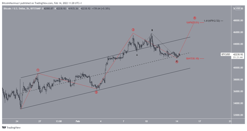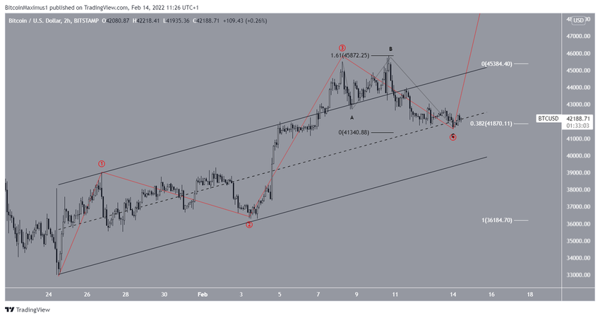 Najbardziej prawdopodobna długoterminowa liczba fal wskazuje, że Bitcoin już osiągnął dno. Krótkoterminowy rachunek (czerwony) sugeruje, że BTC ukończył falę czwartą pięciofalowej formacji wzrostowej. Liczba podfal jest zaznaczona na czarno.