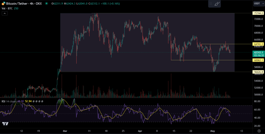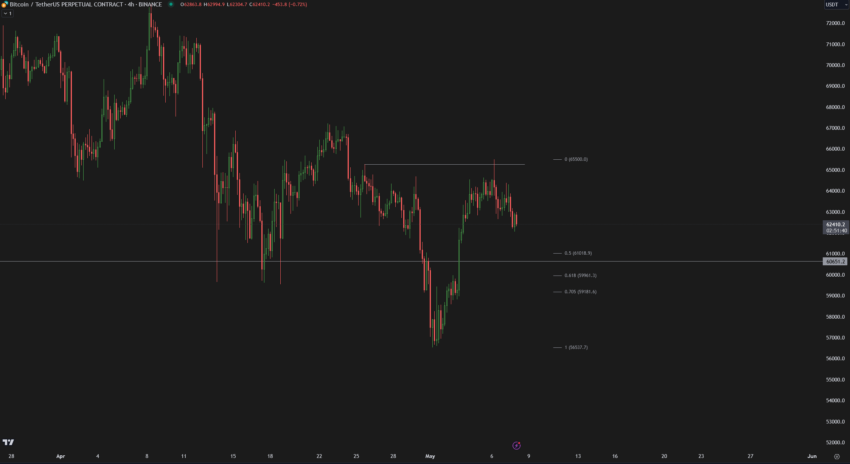 Następnie Crypto_birb przewiduje potencjalną cenę docelową w maju na poziomie około 70 000 USD. Prognoza ta wzmocniona jest pozytywnymi podstawami z rynku Bitcoin ETF i solidną korelacją z S&P 500. Co więcej, analiza obejmuje wsparcie techniczne na poziomie 61 000 USD z oporem w pobliżu 64 000 USD. Przygotowuje to grunt pod możliwe zachowanie, jeśli poziomy te będą skutecznie zarządzane.