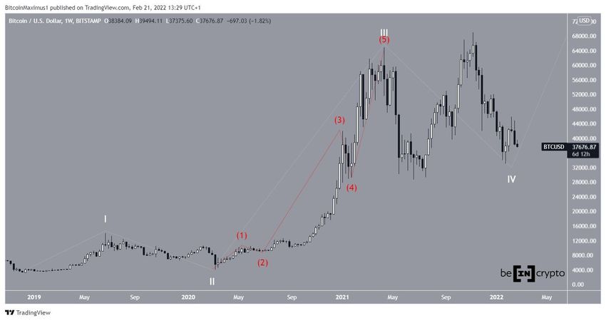 Bitcoin znajduje się w cyklu rynku byka od grudnia 2018 r., kiedy to spadł do dołka na poziomie 3122 USD. Ruch w górę rozwija się w pięciu falach (kolor biały), z których BTC znajduje się obecnie w fali czwartej.