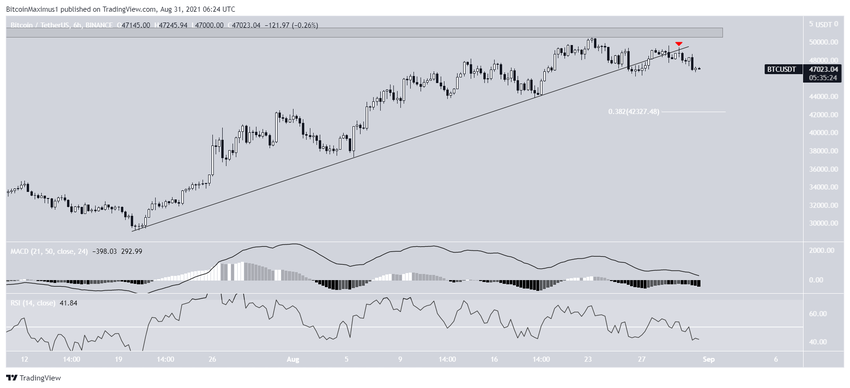 Bitcoin porusza się w dół od dnia 22 sierpnia, po osiągnięciu szczytu na poziomie 50 500 USD. Ten szczyt znajduje się bardzo blisko obszaru oporu 51 200 USD, który jest poziomem oporu zniesienia 0,618 Fib i horyzontalnym obszarem oporu. Jeszcze tego samego dnia utworzona została świeca spadającej gwiazdy.