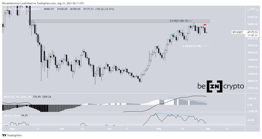 Trwający spadek poprzedzony był znacznymi niedźwiedzimi dywergencjami zarówno na wskaźniku RSI jak i MACD. Z drugiej strony, istnieje potencjalna ukryta bycza dywergencja, która jednak zostałaby unieważniona po zamknięciu poniżej poziomu 46 348 USD z dnia 26 sierpnia.
